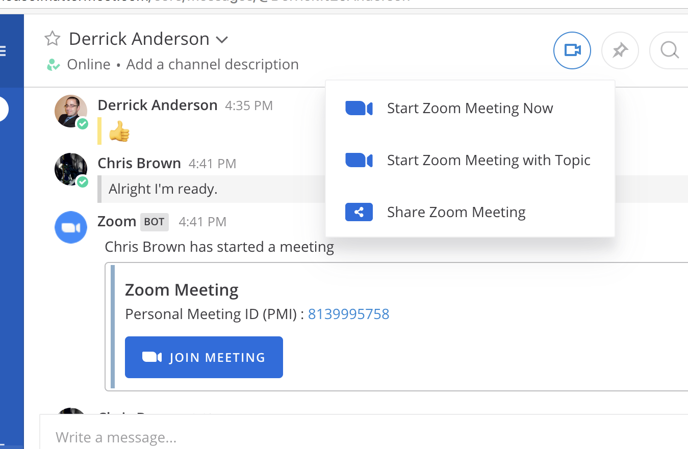 The Zoom plugin for Mattermost adds UI elements that allow users to easily create and join Zoom meetings: